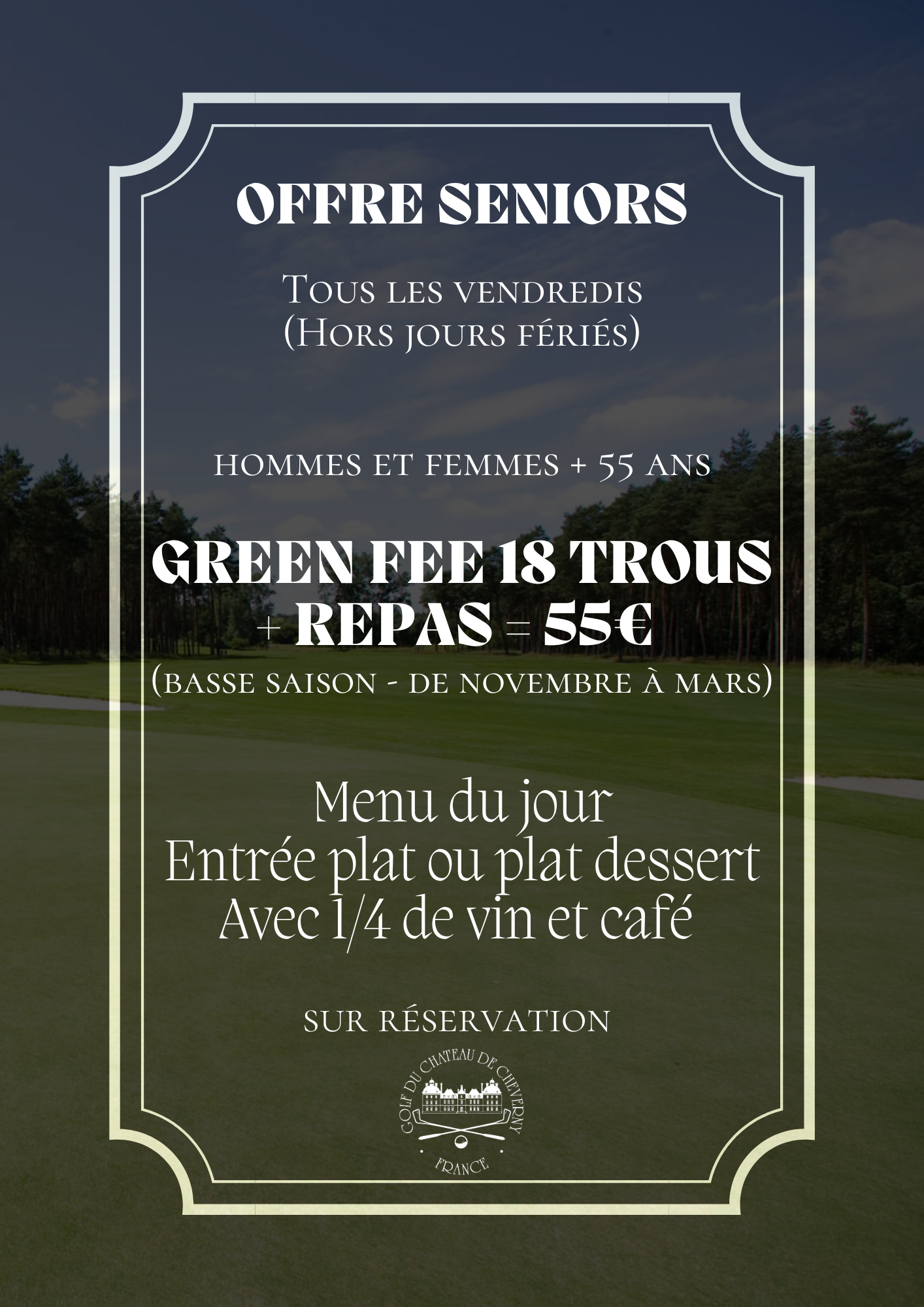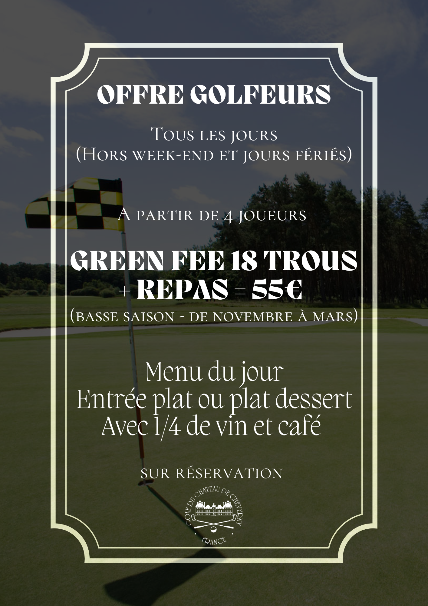 Prenez connaissance de nos tarifs et de nos offres spéciales Les tarifs & offres spéciales Les tarifs 2025 Les offres spéciales Offre SENIORS Offre GOLFEURS Réservation Vous êtes membres ? Réservez vos parcours directement en ligne : Réserver Accéder au Golf